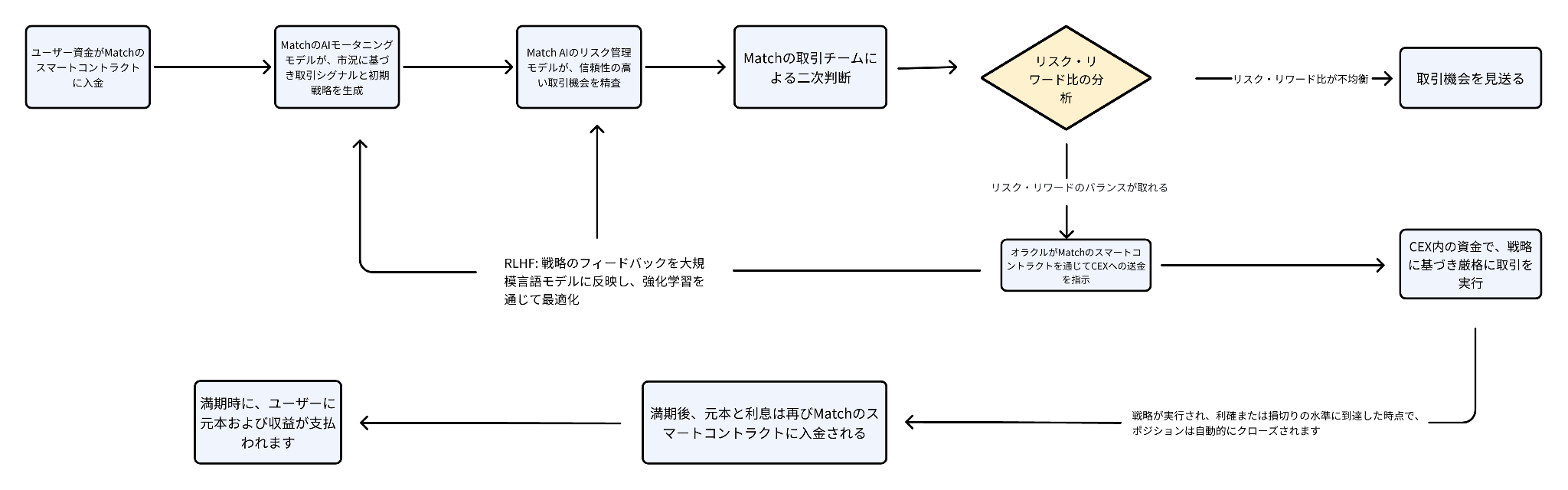 Matchは、ユーザーが提供したUSDCをもとにAIと経験豊富な運用スタッフが協働して運用し、成果を分配する仕組みです。